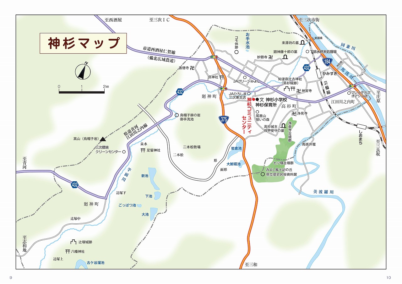中でも神杉地域と田幸地域にまたがった浄楽寺・七ツ塚古墳群は、弥生、古墳時代の繁栄を物語るもので、広島県立歴史民俗資料館・みよし風上記の丘が整備されています。また、神杉地域の町名や字名などは、地域に古くから伝えられてきた故事や伝説に由来し、特に神杉にいわれのある「日子穂々出見命天降り伝説」は有名です。「民族の宝」「心のふるさと」を訪ねるのには格好の地域であると言えます。